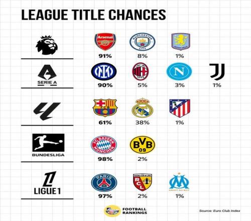 虽然本赛季还有十几轮才会结束,不过,在五大联赛的对比各领跑者的姿态是越发的明确了。就此,数据机构EuroClubIndex也是给出了预测,就五大联赛夺取奖杯的几率给出计算。